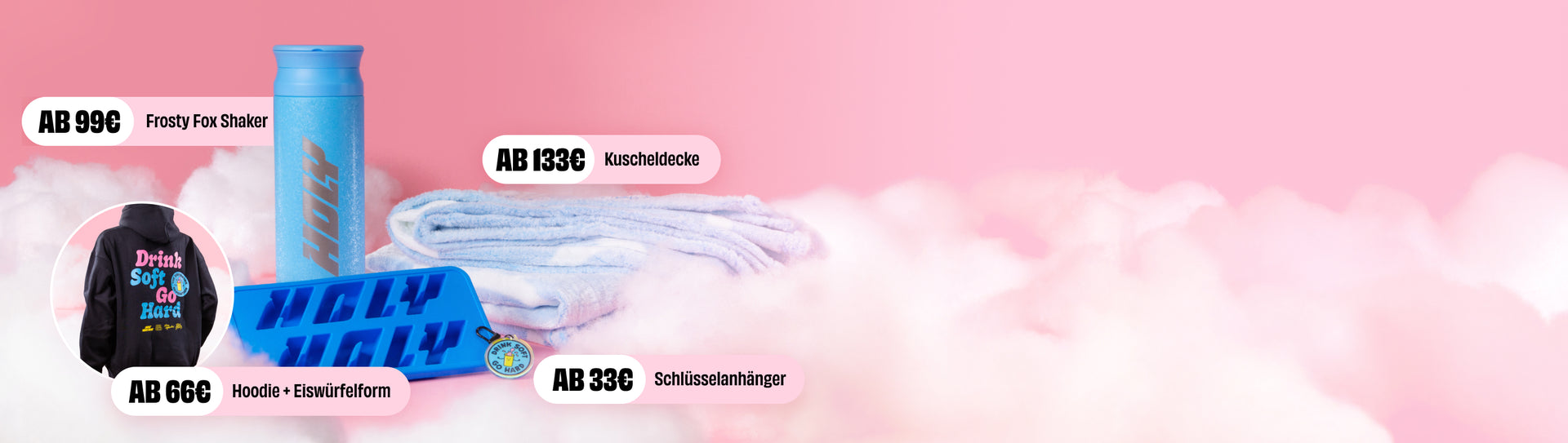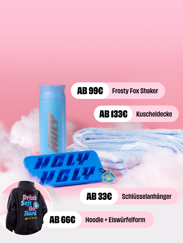 Ab 33 € gibt’s den Schlüsselanhänger, ab66 € die Eiswürfelform und den Premium-Hoodie,ab 99 € den exklusiven 1L Thermo Shaker und ab 133 € die kuscheligste Kuscheldecke aller Zeiten.